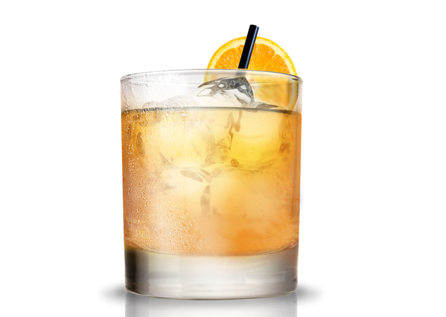 Throw your ice in to the shaker, add all the ingredients except your garnishes, shake with gusto for 20-30 secs, strain into your glass, add two ice cubes, the cherry, slice of orange and a cocktail straw. If you want this a little sweeter, add a tsp of the cherry juice. Enjoy